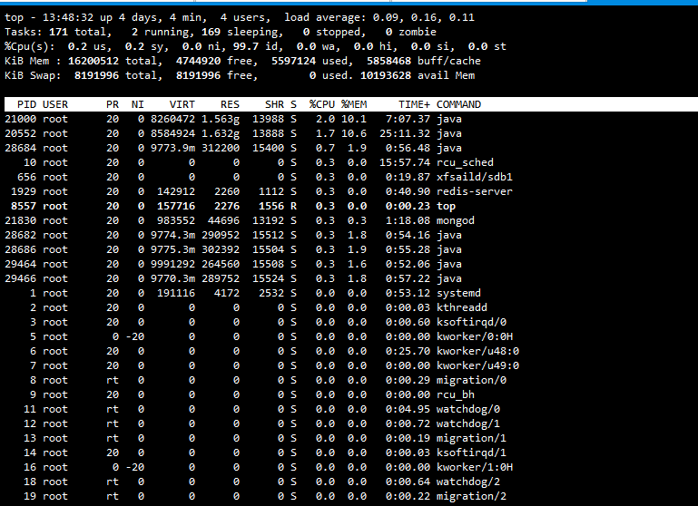 - 第二行:进程总数(total) + 正在运行进程数(running) + 睡眠进程数(sleeping) + 停止的进程数(stopped)+ 僵尸进程数(zombie)