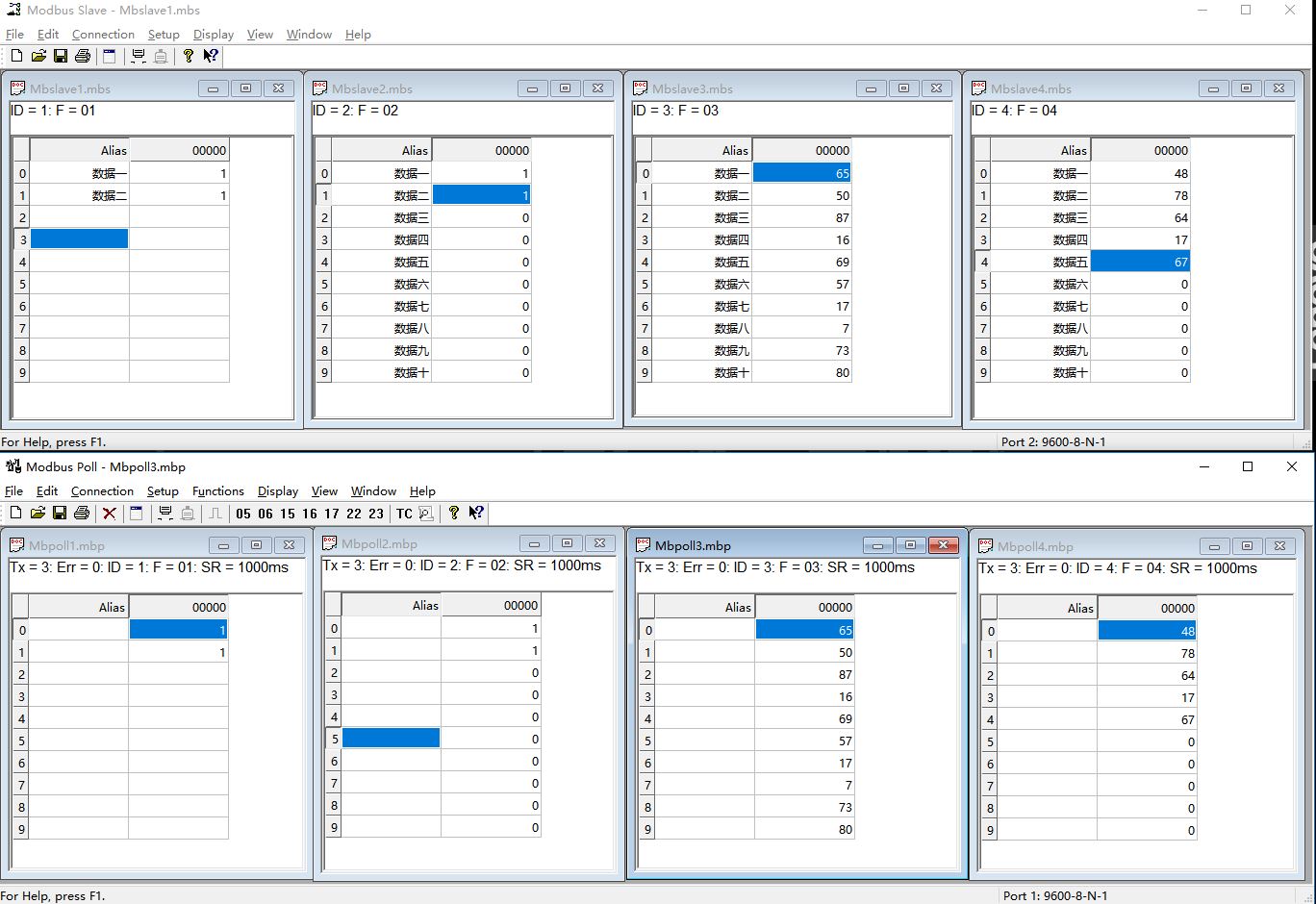 这里是4组测试。ModbusSlave模拟4个设备的数据。ModbusPoll中去分别获取四个设备的数据。测试依据参考Modbus数据类型,读写情况。这里简单的测试4种读。