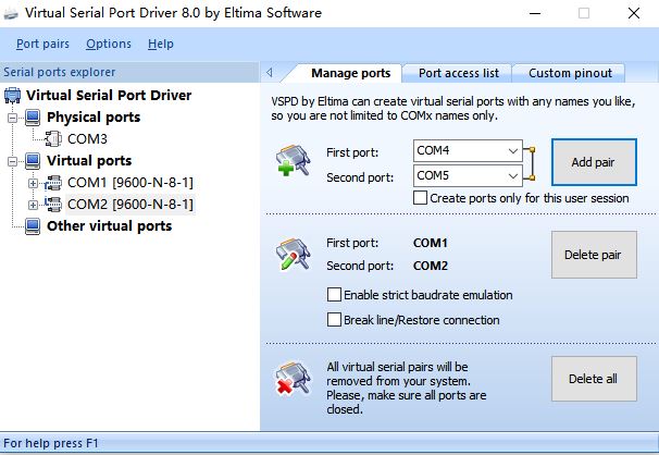 首先需要模拟一个COM串口。不然怎么测试呢。自行百度VSPD。