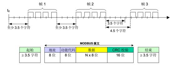 - Modbus 的 RTU 模式规定不同数据帧之间的间隔是3.5个字节通信时间以上。如果在一帧数据完成之前有超过3.5个