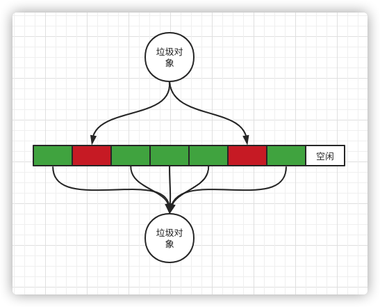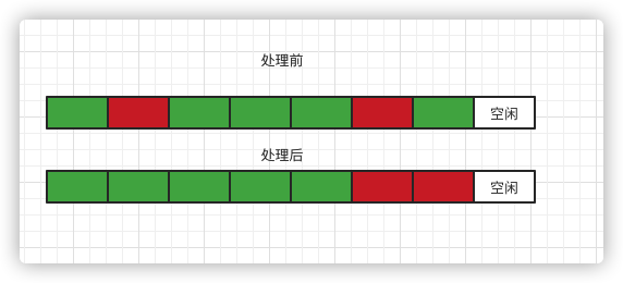 - 将垃圾对象占用用的空间标记成空闲,记录在一个空闲列队中,当需要分配新对象的时候,就从空间列队中找到合适的空间分配给这个对象。但是垃圾对象是散落在内存空间各处,并不是连续存放的。当需要分配一段连续大的内存空间的时候,可能出现没有足够空闲空间的问题。