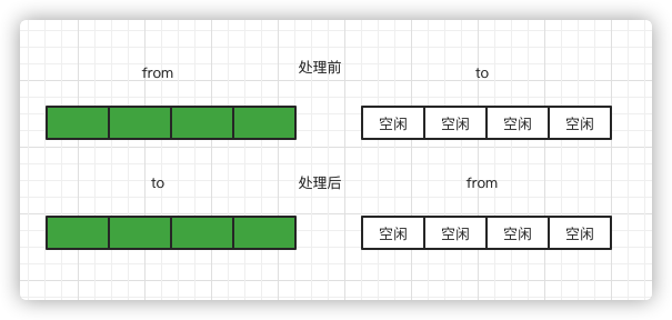 - 将堆空间拆分成2空间from、to,其中一部分创建对象,当from空间对象使用完成后,将标记过的对象复制到to空间中,当对象从from复制到to空间后,两个空间交换引用,继续在from空间创建对象,一直到from空间满了。这里的空闲是指标记空闲。
