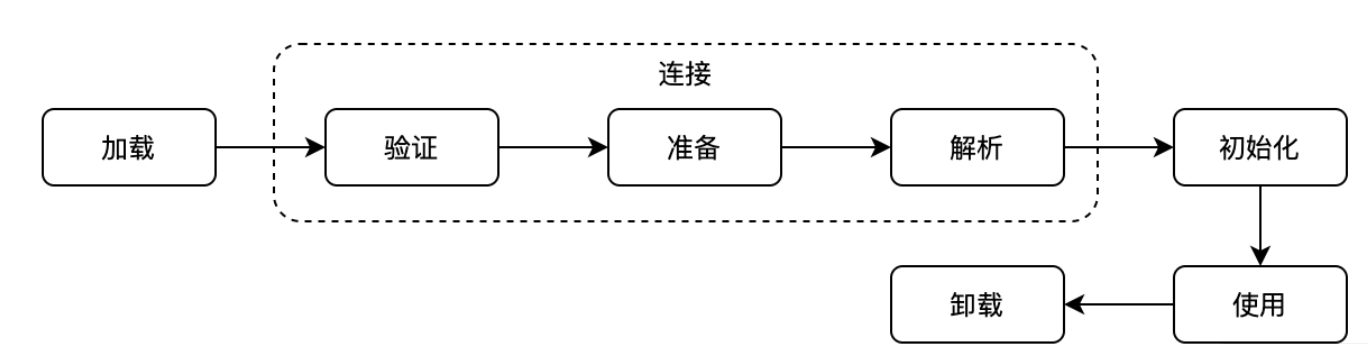 此阶段用于查到相应的类(通过类名进行查找)并将此类的字节流转换为方法区运行时的数据结构,然后再在内存中生成一个能代表此类的 java.lang.Class 对象,作为其他数据访问的入口。