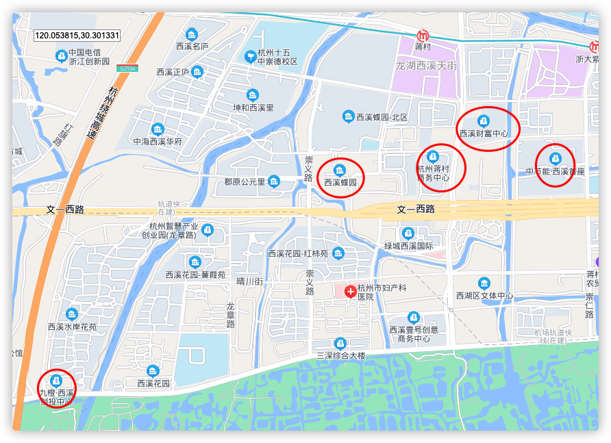 # 中心坐标 120.075338 30.294845 500m内的位置。